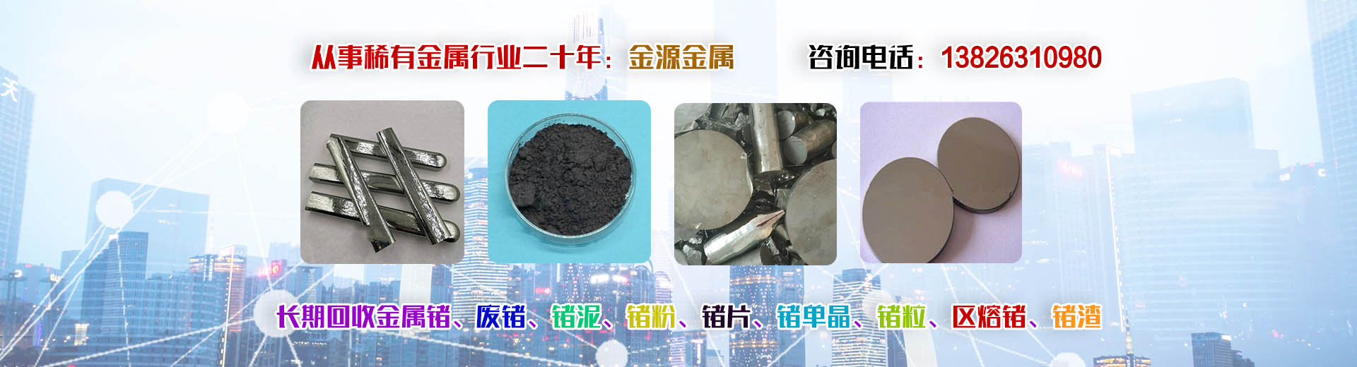 韶關市金源金屬材料有限公司坐落于中國廣東省韶關市,長期收購回收銦、精銦、粗銦、銦絲、銦靶材、ITO靶材靶粉、回收金屬鍺、鍺錠、鍺粉、鍺片、回收鍺單晶、單晶鍺、鍺粒、區(qū)熔鍺、工業(yè)鍺、廢鍺、鍺泥、鍺渣、二氧化鍺回收、四氯化鍺、有機鍺、銀、純銀、銀靶材、高價收購回收ITO廢靶、回收廢銦、廢銦沙、廢銦渣、回收粗銦、廢銦絲、廢銦珠、廢銦箔、廢銦棒、收購銀焊條、銀焊絲、導電銀膠、金屬鎵、硝酸鎵、氧化鎵、三氯化鎵、氯化鎵,供應及回收氧化鎵、氫氧化鎵、碲化鎵,硒化鎵,銦粉,氧化銦、氯化銦、硫酸銦、硫化銦、醋酸銦、氫氧化銦、硒化銦,碘化銦,銅銦鎵硒,含金、銀、銦、銠、鈀、鎵、鍺等稀有貴金屬材料,稀土金屬材料、氧化鏑、氧化镥、氧化鋱、氧化鐠釹等回收。